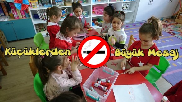 Yaptıkları panoda sigaralarının üzerine çarpı sembolleri koyan miniklerimiz büyüklerin hem kendilerini, savurdukları dumanı ile çevresindekileri zehirlediklerini anlatmaya çalıştılar.