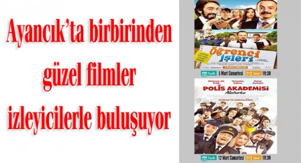 Ayancık Belediye Kültür Merkezi'nde, 5 Mart Cumartesi günü saat: 19.30'da "Öğrenci İşleri", 12 Mart Cumartesi saat:19. 30'da ise "Polis Akademisi Alaturka" adlı film gösterime sunulacağı öğrenildi.