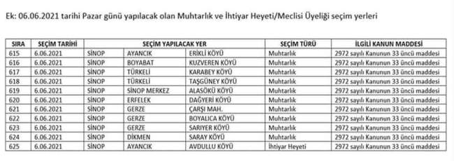 Sandık başına gidecek mahalle ve köyler Yüksek Seçim Kurulunun internet adresinden paylaşıldı. Buna göre; Sinop genelinde 6 Haziran 2021 tarihinde toplam 11 yerde ara seçime gidilecek.