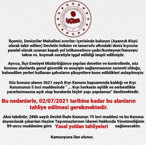 Ayancık denizciler Mahallesindeki kapalı yol istikametince (Ayancık Köyü) vatandaşların koydukları çadır, konteyner, karavan, ve tekneler tahliye edilecek.