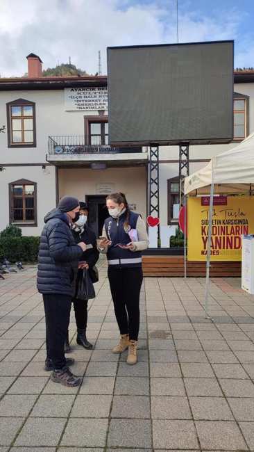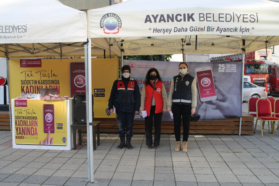 25 Kasım Kadına Yönelik Uluslararası Şiddetle Mücadele Günü kapsamında KADES uygulamasını halka tanıtmak ve farkındalığı artırmak amacıyla ilçe Emniyet Müdürlüğü, İlçe Jandarma Komutanlığı ve İlçe Sosyal Hizmet Merkezi Müdürlüğü iş birliği ile Ayancık Demokrasi ve Cumhuriyet Meydanı’nda stant kuruldu. Burada broşür dağıtan ekipler, KADES uygulamasına ilişkin vatandaşları bilgilendirdi.