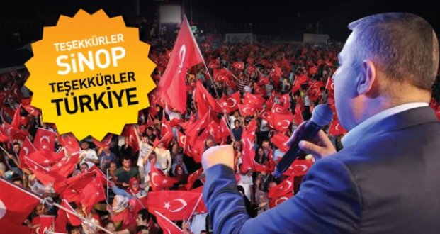 Sinop’umuzda bütün ilçeleriyle, bütün siyasi görüşlerden vatanperver insanlarıyla sokağa, meydanlara demokrasiye sahip çıkmak için inmişlerdir.