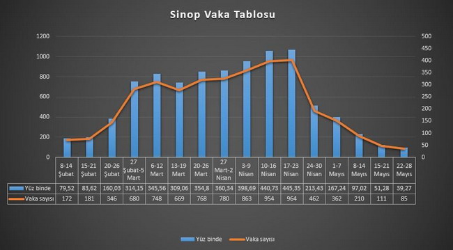 Sağlık Bakanı Dr. Fahrettin Koca’nın paylaştığı 22-28 Mayıs tablosunda vaka oranlarındaki gerilemesini sürdüren Karadeniz’in en risksiz ili Sinop, yüz binde 39,27 vaka oranıyla 5 basamak daha aşağıya inerek en düşük vaka oranına sahip 13. il oldu.