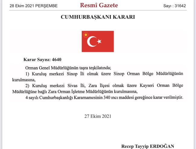 Cumhurbaşkanı Recep Tayyip Erdoğan tarafından onaylanan; 'Kuruluş merkezi Sinop ili olmak üzere Sinop Orman Bölge Müdürlüğünün kurulmasına' ilişkin karar, 28 Ekim 2021 Tarih ve 31642 Sayılı Resmi Gazete'de yayınlandı.