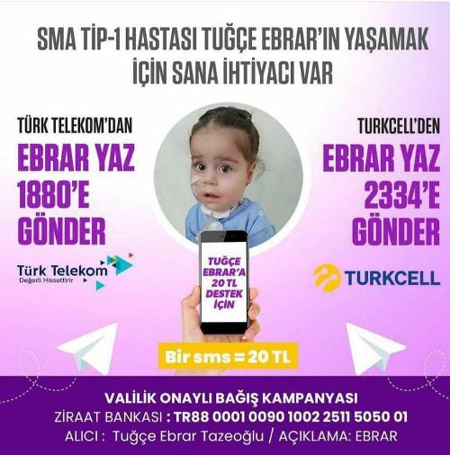 Tuğçe Ebrar’ın ablası Fatma Nur Tazeoğlu, (2 1) annesi ile birlikte kardeşi nin nefes alması için mücadele ediyor. Abla Tazeoğlu, “Ebrar doğduğunda hareketsiz bir bebek olduğunu fark ettik. 3 aylıkken boynunu tutamadığı ve ayaklarının üzerine basamadığını gördük. Onun için hastaneye götürdük. Kas enzimleri yüksek çıktı ve genetik tanı merkezine tahlil verdik. 6 aylıkken tahlil sonucumuz geldi ve SMA Tip-1 kas hastası olduğunu öğrendik.” dedi.